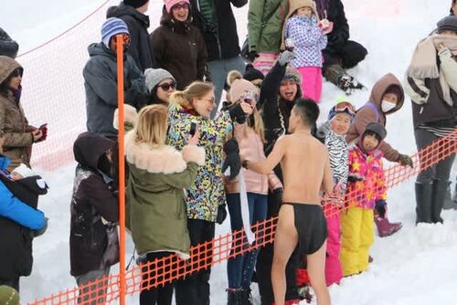上記写真は日曜日に開催された「くっちゃん雪トピアフェスティバル」での一コマ。 ふんどし姿の男性が、外国人客にワインを振る舞っておったです。 この日は、特設斜面を滑り降り、13メートルのプールをスキーやスノボで渡り切ると賞品がもらえる「激走!…