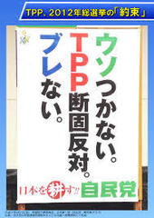 「ウソつかない。TPP断固反対。ブレない。日本を耕す自民党」だ。