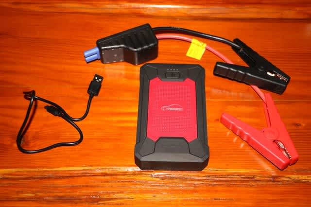 左のコードは、USBポートでこのスターター本体に充電するもの。